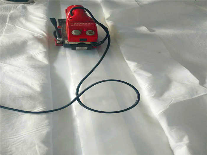 1.3長絲土工布還可以采用熱風焊接的連接方法,即用熱風槍對兩片布的連接瞬間高溫加熱,使其部分達到融熔狀態,并立即使用一定的外力使其牢牢地粘合在一起.在潮濕(雨雪天)天氣不能進行熱粘連接.縫合時最小寬度10cm,自然搭接時最小寬度為20cm、熱風焊接時最小寬度為20cm.