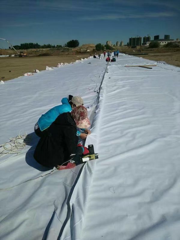 鋪設(shè)現(xiàn)場進(jìn)入人員不得穿釘芏、高跟鞋及硬底鞋,開始做業(yè)后,嚴(yán)禁在可能危害土工膜的范圍內(nèi)進(jìn)行交叉作業(yè),同時避免火源。具體施工中應(yīng)該注意以下幾點(diǎn):清除鋪設(shè)范圍支持層的各種錐形、尖棱雜物;每天土工膜展開的數(shù)量不得超過焊接范圍;鋪設(shè)時應(yīng)該考慮到材料的熱脹冷縮導(dǎo)致的尺寸變化,預(yù)留出一定的伸縮量,且應(yīng)避開夏季中午高溫時段。所有外露的土工膜邊緣須用砂舊輪胎等物壓載物壓覆,避免被風(fēng)吹起;
